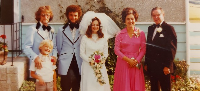 She always dressed quite glamorously, as I viewed it, and she ran that store in downtown Dawson Creek for 25 to 30 years, after they moved from Williams Lake but right before Dad graduated high school. I believe Dad once characterized it as being abandoned or left behind, with regard to the timing. He laughed at that too, when he told me. She seemed to wear a lot of makeup. But I think now of her distinctive cheekbones and how she talked. Maybe it’s morbid, but I still have a recording of her voice from the mid 90s on a cassette of incoming messages from my beloved Panasonic answering machine.